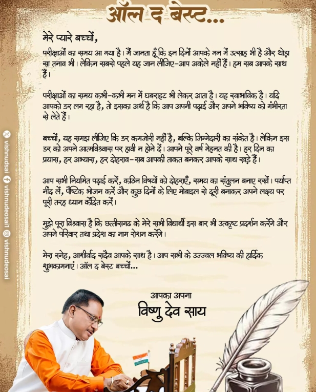 रायपुर। CM साय ने परीक्षा में शामिल हो रहे स्टूडेंट्स के लिए ट्वीट किया है, मेरे प्यारे बच्चों, परीक्षाओं का समय आ गया है। मैं जानता हूँ कि इन दिनों आपके मन में उत्साह भी है और थोड़ा सा तनाव भी। लेकिन सबसे पहले यह जान लीजिए-आप अकेले नहीं हैं। हम सब आपके साथ हैं। परीक्षाओं का समय कभी-कभी मन में घबराहट भी लेकर आता है। यह स्वाभाविक है। यदि आपको डर लग रहा है, तो इसका अर्थ है कि आप अपनी पढ़ाई और अपने भविष्य को गंभीरता से लेते हैं। बच्चों, यह समझ लीजिए कि डर कमजोरी नहीं है, बल्कि जिम्मेदारी का संकेत है। लेकिन इन्स डर को अपने आत्मविश्वास पर हावी न होने दें। आपने पूरे वर्ष मेहनत की है। हर दिन का प्रयास, हर अभ्यास, हर दोहराव-सब आपकी ताकत बनकर आपके साथ खड़े हैं।आप सभी नियमित पढ़ाई करें, कठिन विषयों को दोहराएँ, समय का संतुलन बनाए रखें। पर्याप्त नींद लें, पेंष्टिक भोजन करें और कुछ दिनों के लिए मोबाइल से दूरी बनाकर अपने लक्ष्य पर पूरी तरह ध्यान केंद्रित करें।मुझे पूरा विश्वास है कि छत्तीसगढ़ के मेरे सभी विद्यार्थी इस बार भी उत्कृष्ट प्रदर्शन करेंगे और अपने परिवार तथा प्रदेश का नाम रोशन करेंगे। मेरा स्नेह, आशीर्वाद सदैव आपके साथ है। आप सभी के उज्ज्वल भविष्य की हार्दिक शुभकामनाएं। ऑल द बेस्ट बच्चों…