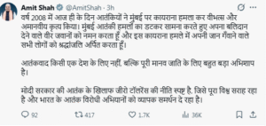 गृहमंत्री अमित ने मुंबई में 2008 में हुए आतंकी हमले में मारे गए लोगों को श्रद्धांजलि देते हुए कहा, कि आज ही के दिन आतंकियों ने मुंबई पर कायराना हमला कर वीभत्स और अमानवीय कृत्य किया। मुंबई आतंकी हमलों का डटकर सामना करते हुए अपना बलिदान देने वाले वीर जवानों को नमन करता हूं ।